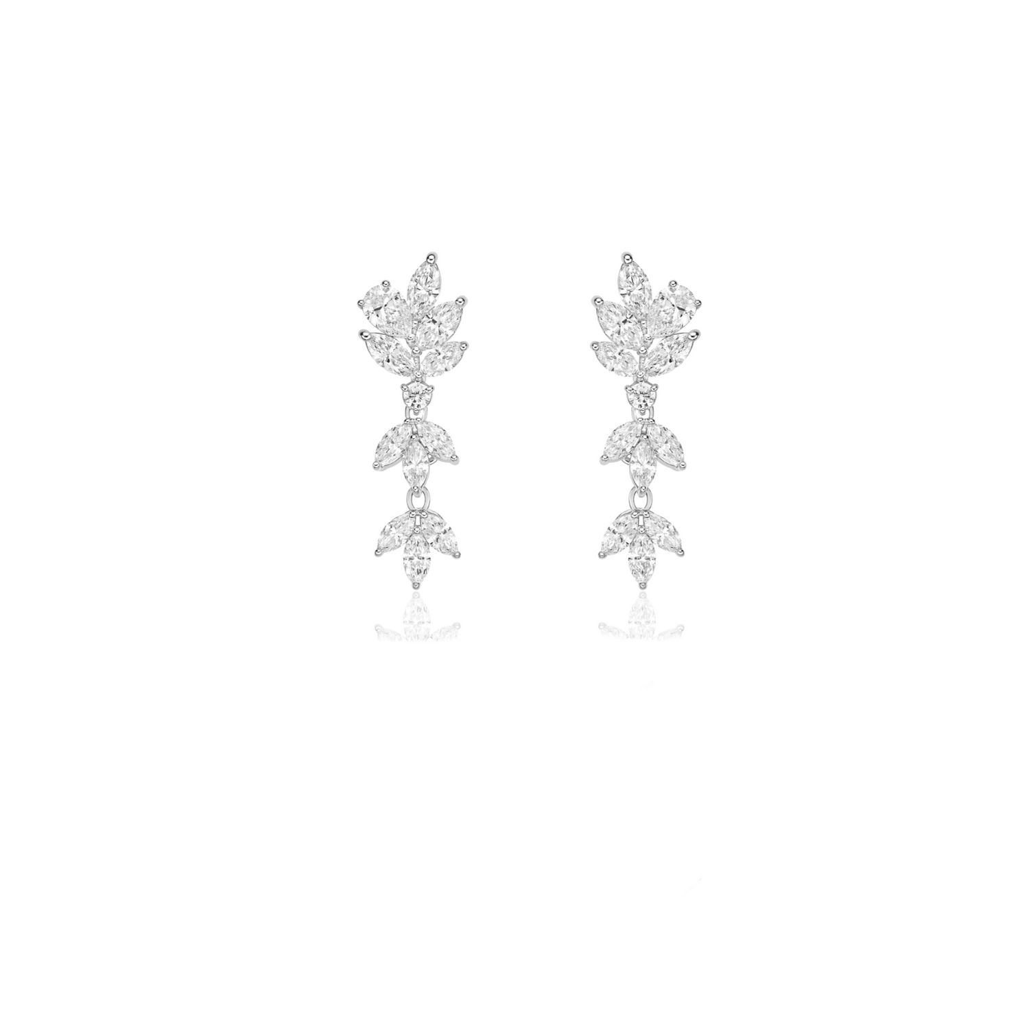 The four sections of the drop earrings are connected with tiny hooks and brackets at the back and can be detached as needed. This full length version is perfect to be worn with the wedding gown.