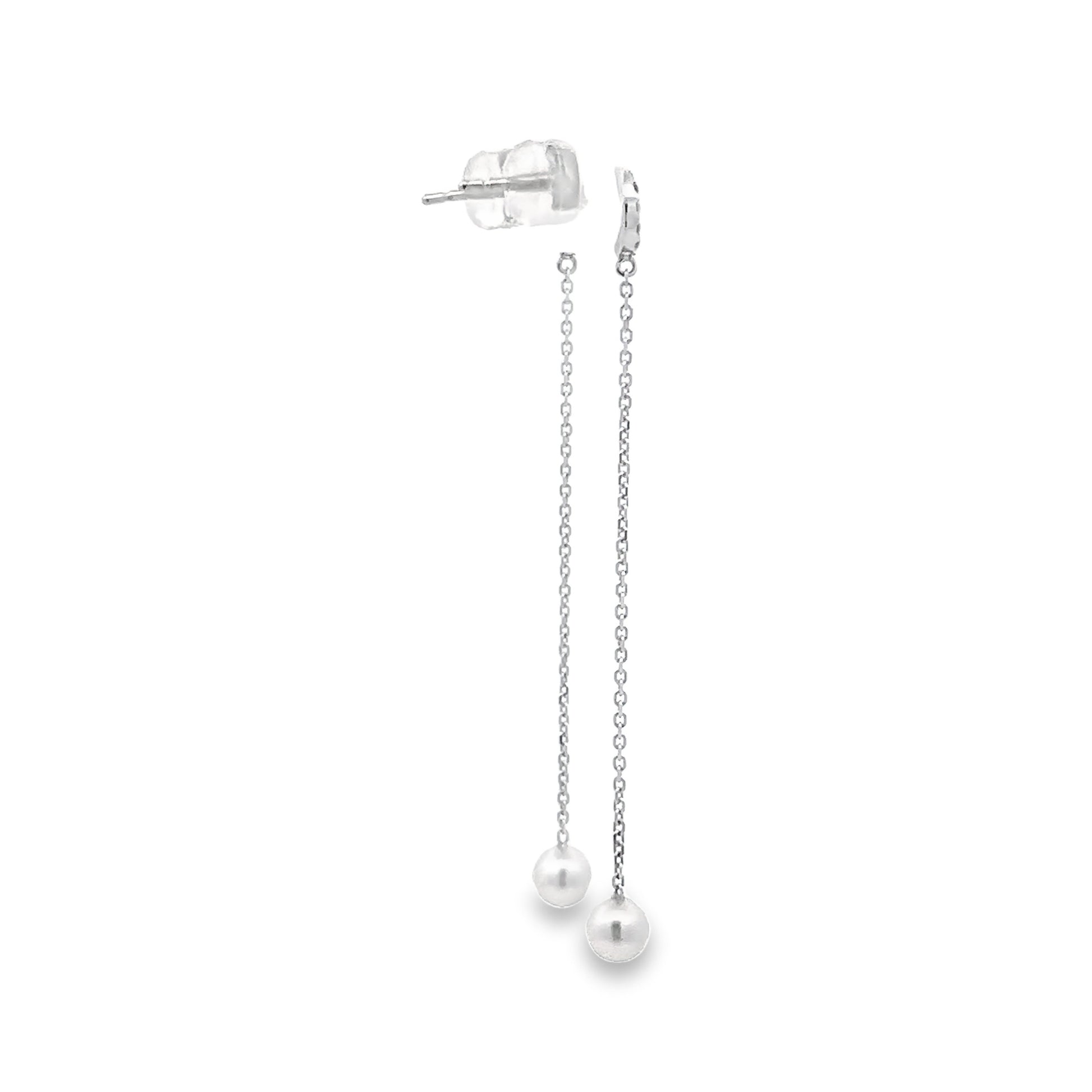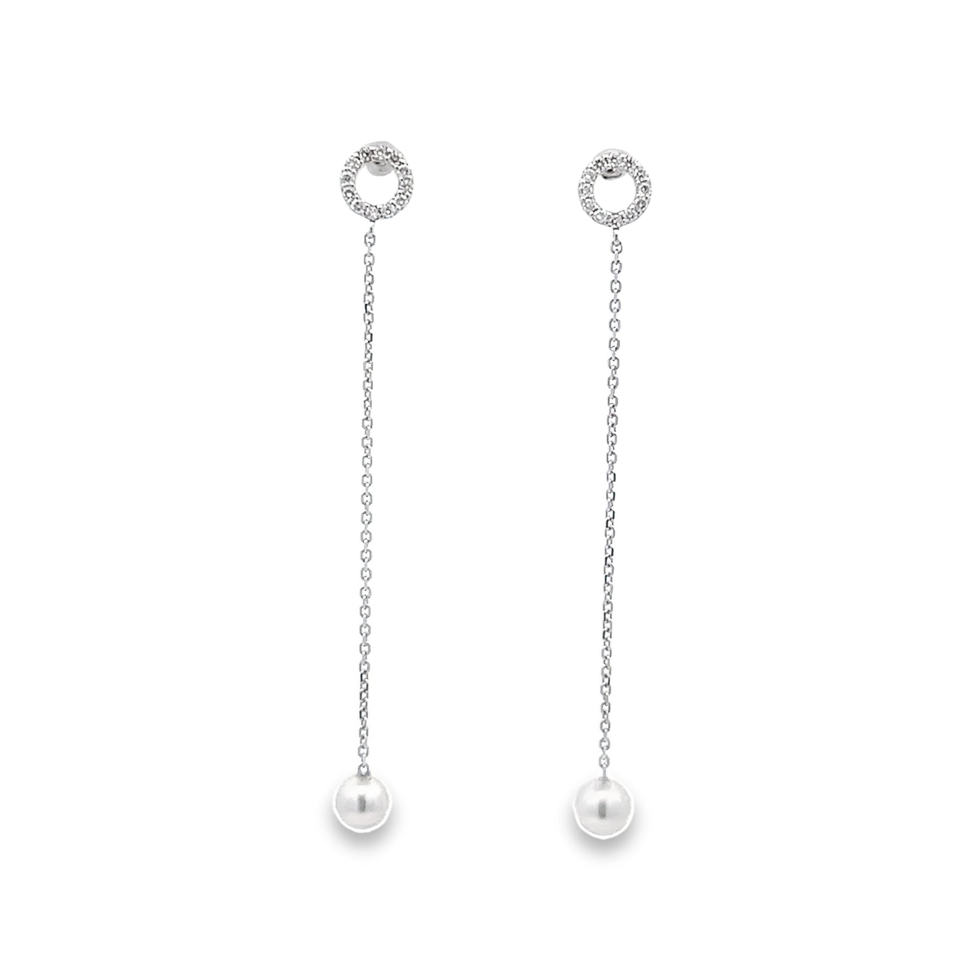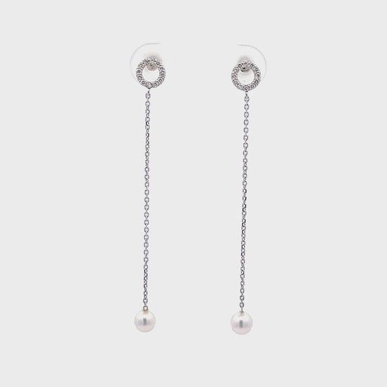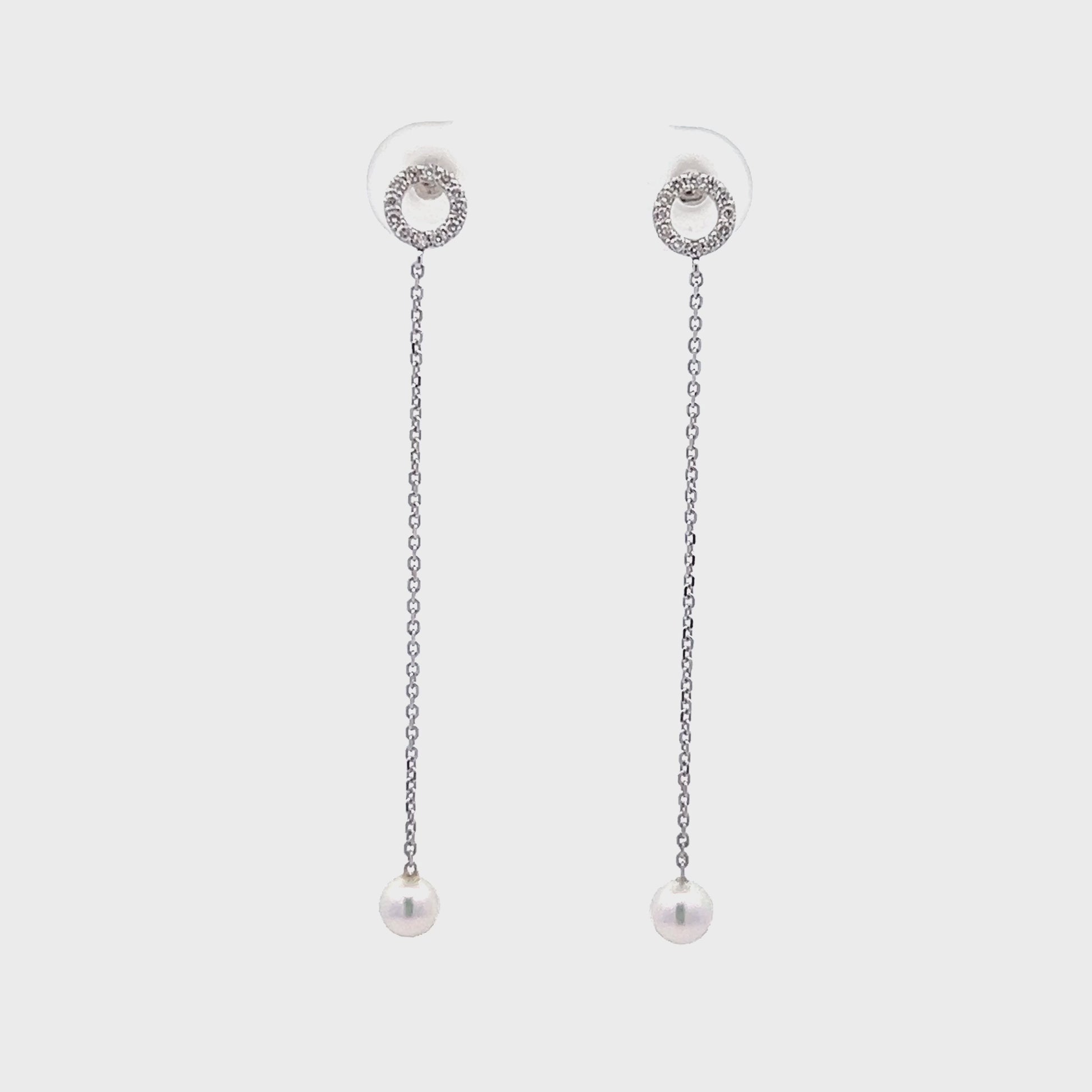 Crafted with shimmering Akoya Pearls dangling from delicate white gold chains, these earrings are topped by sparkling circle diamond studs for an enchanting finish.