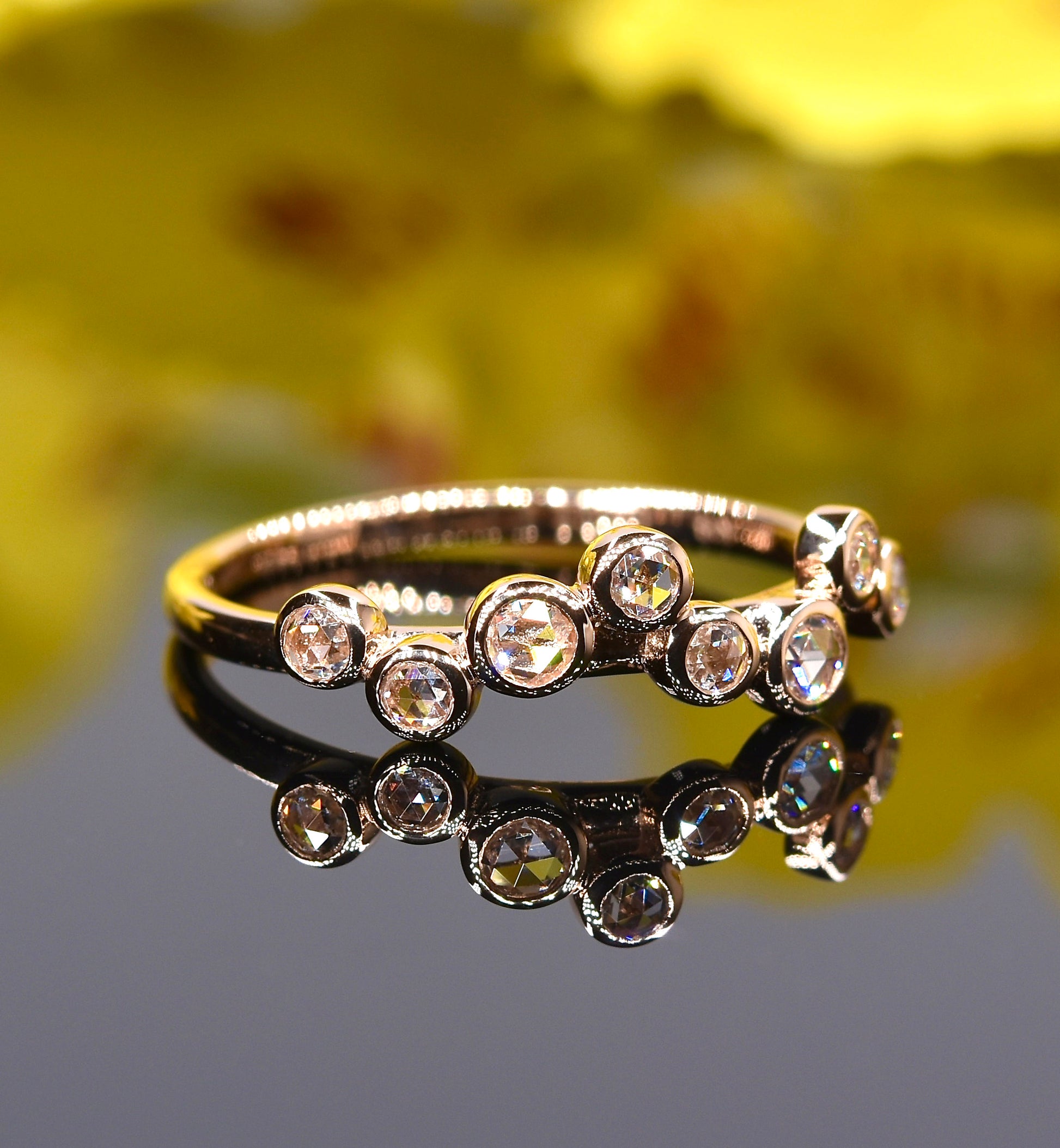 Round bezel set rose-cut diamond ring with 6x0.02ct and 2x0.05ct diamonds in 18K rose gold