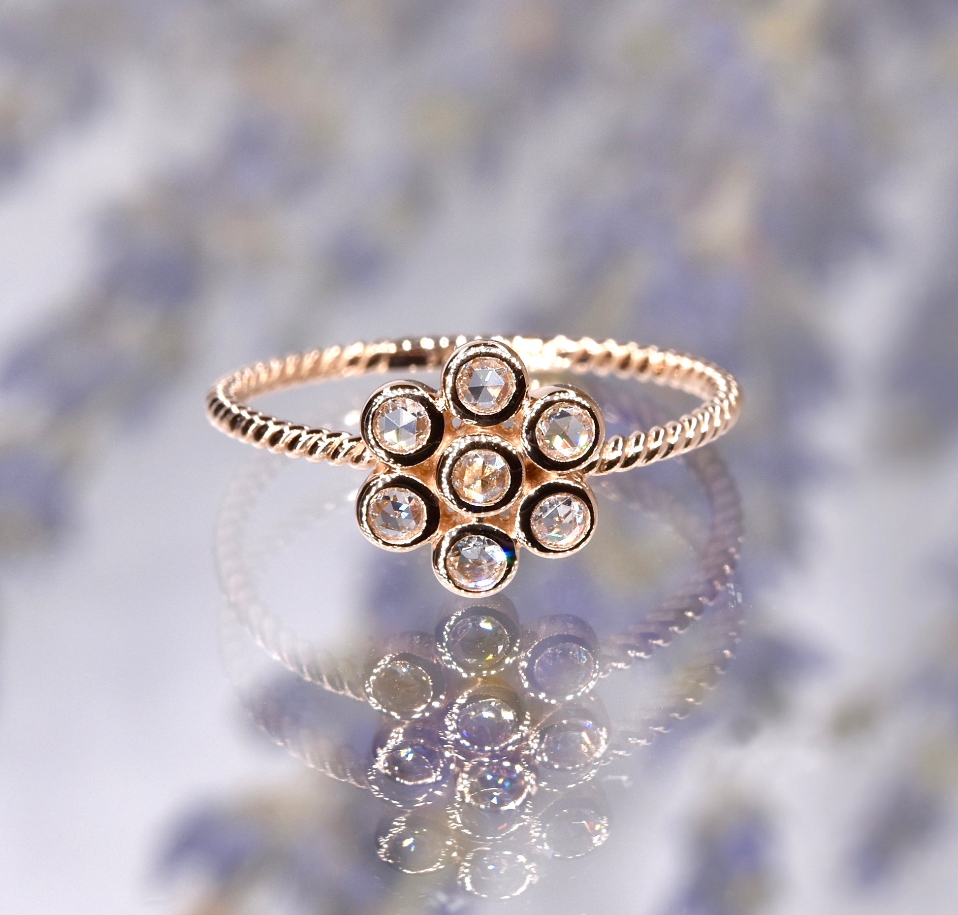 Round bezel set rose-cut diamond cluster ring with 7x0.02ct diamonds in 18K rose gold