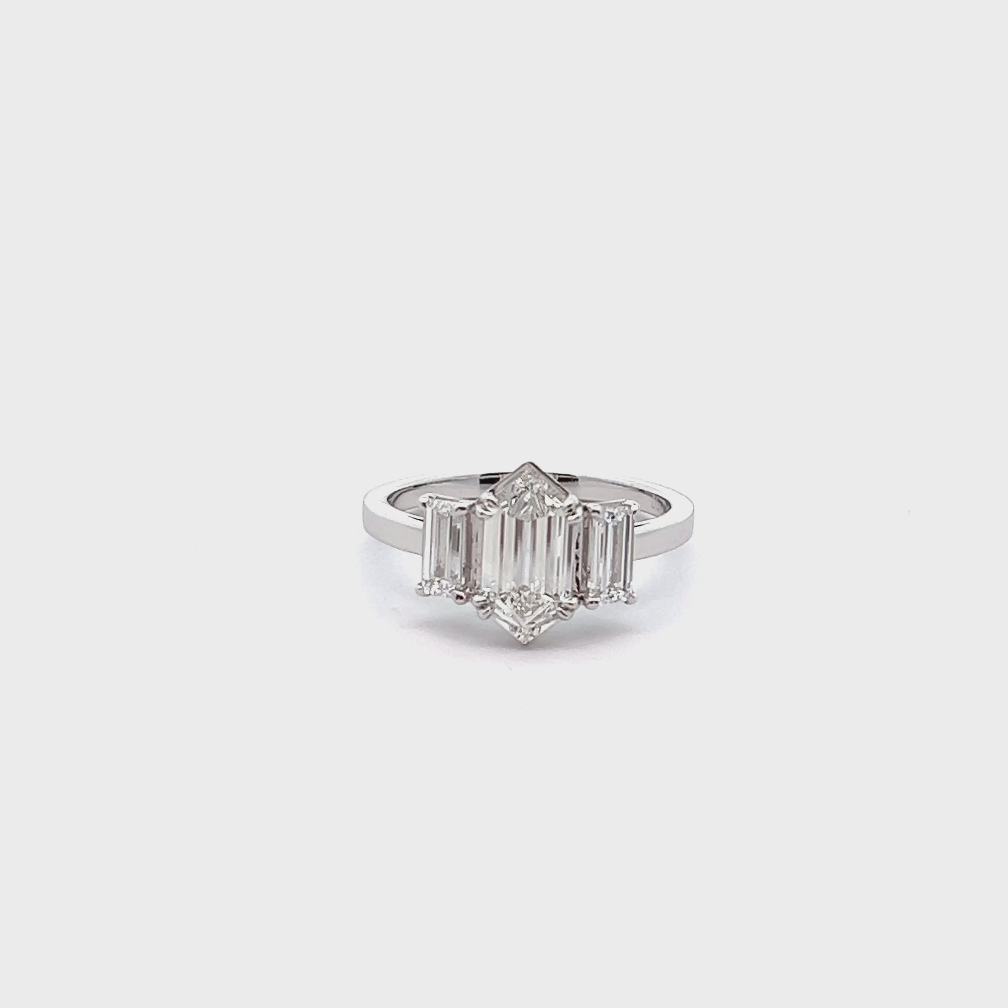 Long hexagon F/VVS2 1.27ct lab-grown diamond ring set with two baguette lab-grown diamonds total 0.63ct set in platinum. IGI certificate available on centre stone