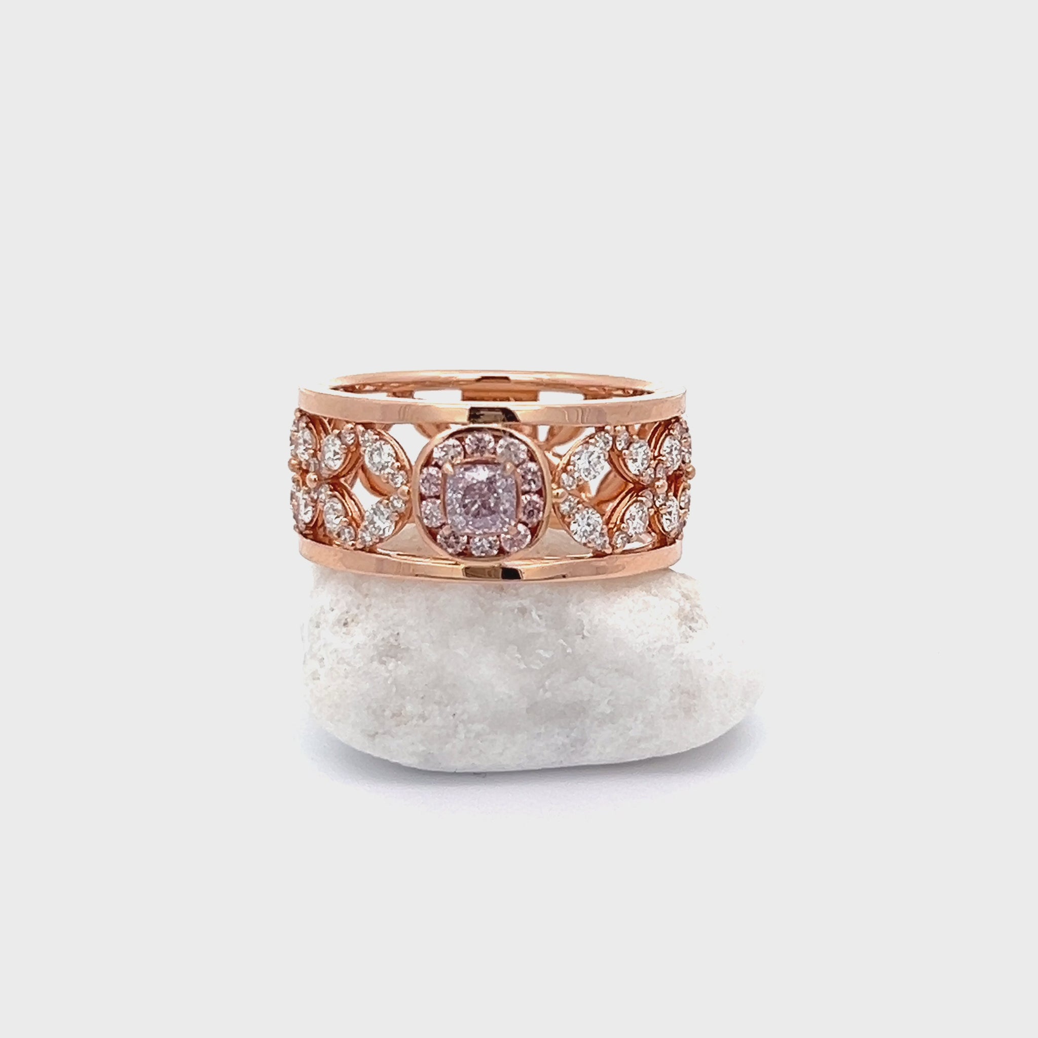 Experience luxury with this exquisite pink diamond ring, featuring a mesmerizing central 0.26ct cushion cut pink diamond, and a halo of shimmering pink diamonds total 0.13ct that encircle the centre gemstone. The intricate design along the band adds a touch of vintage charm to this modern masterpiece.