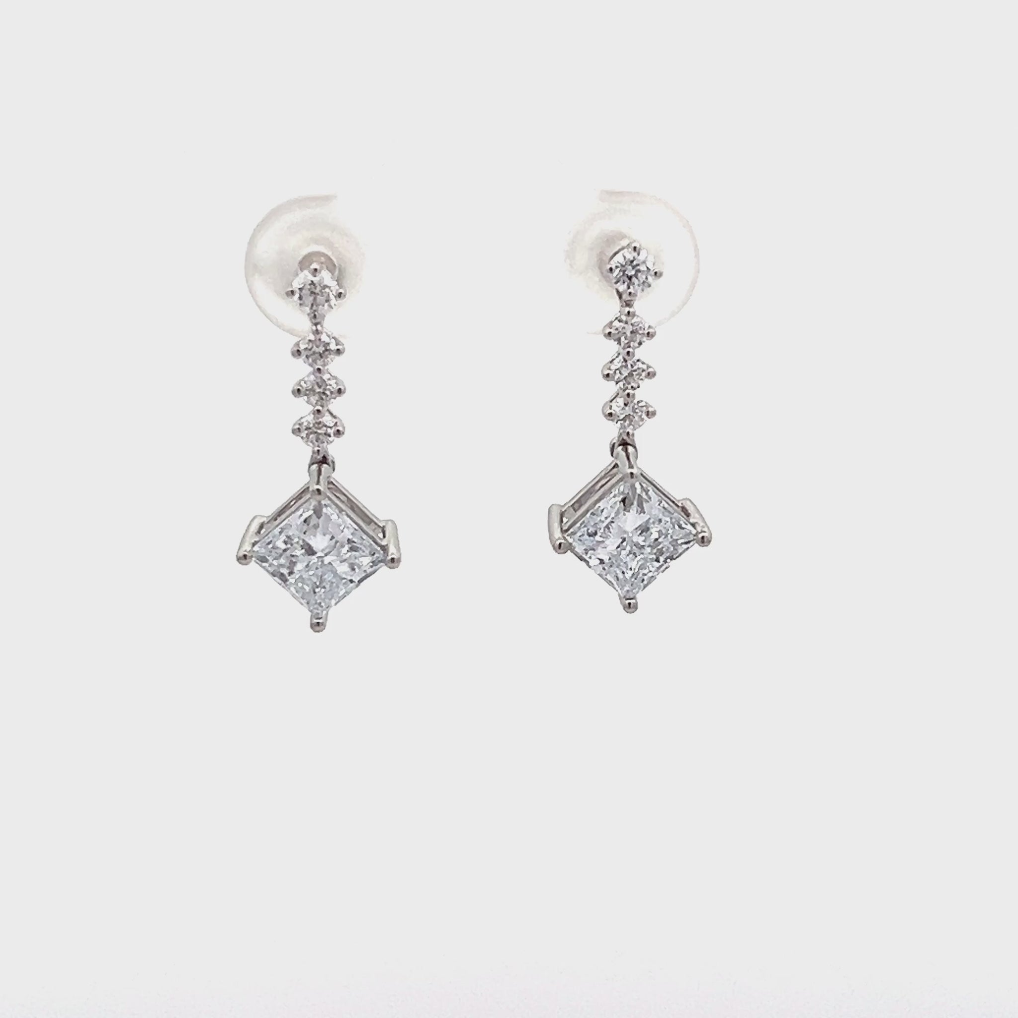 Princess cut lab-grown diamond dangle earrings total 2.25ct set with eight round lab-grown diamonds total 0.31ct set in platinum