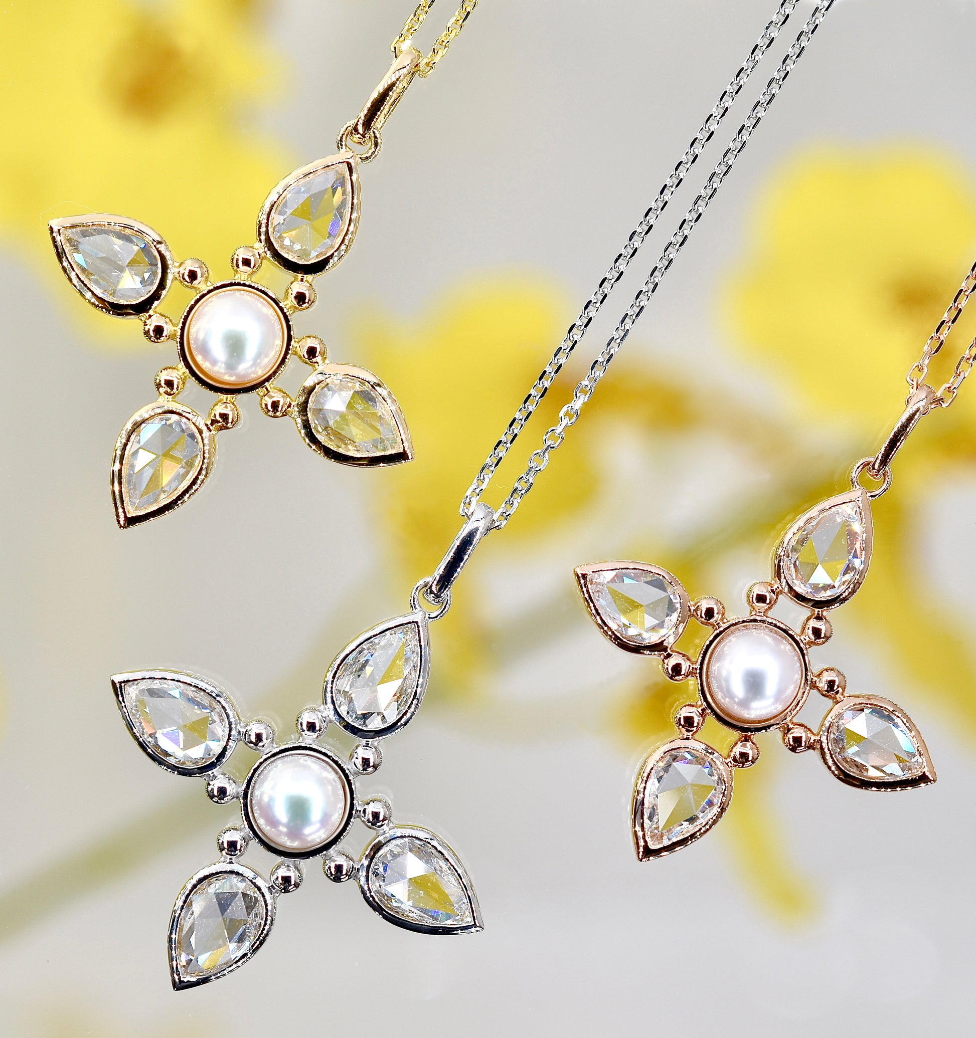 Discover elegance redefined with our exquisite Rose-cut diamond and Akoya Pearl Cross Pendant. Crafted from the finest 18K rose gold, this pendant features a radiant array of pear shape diamonds and a lustrous central pearl, embodying both grace and sophistication.