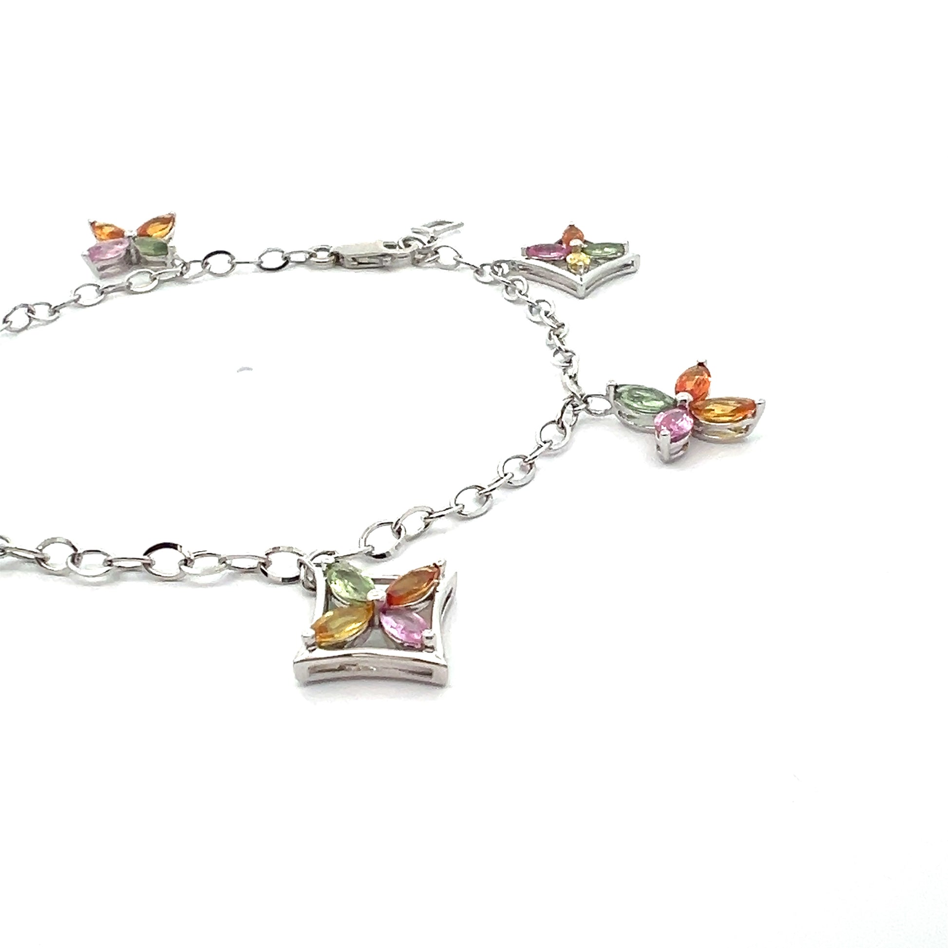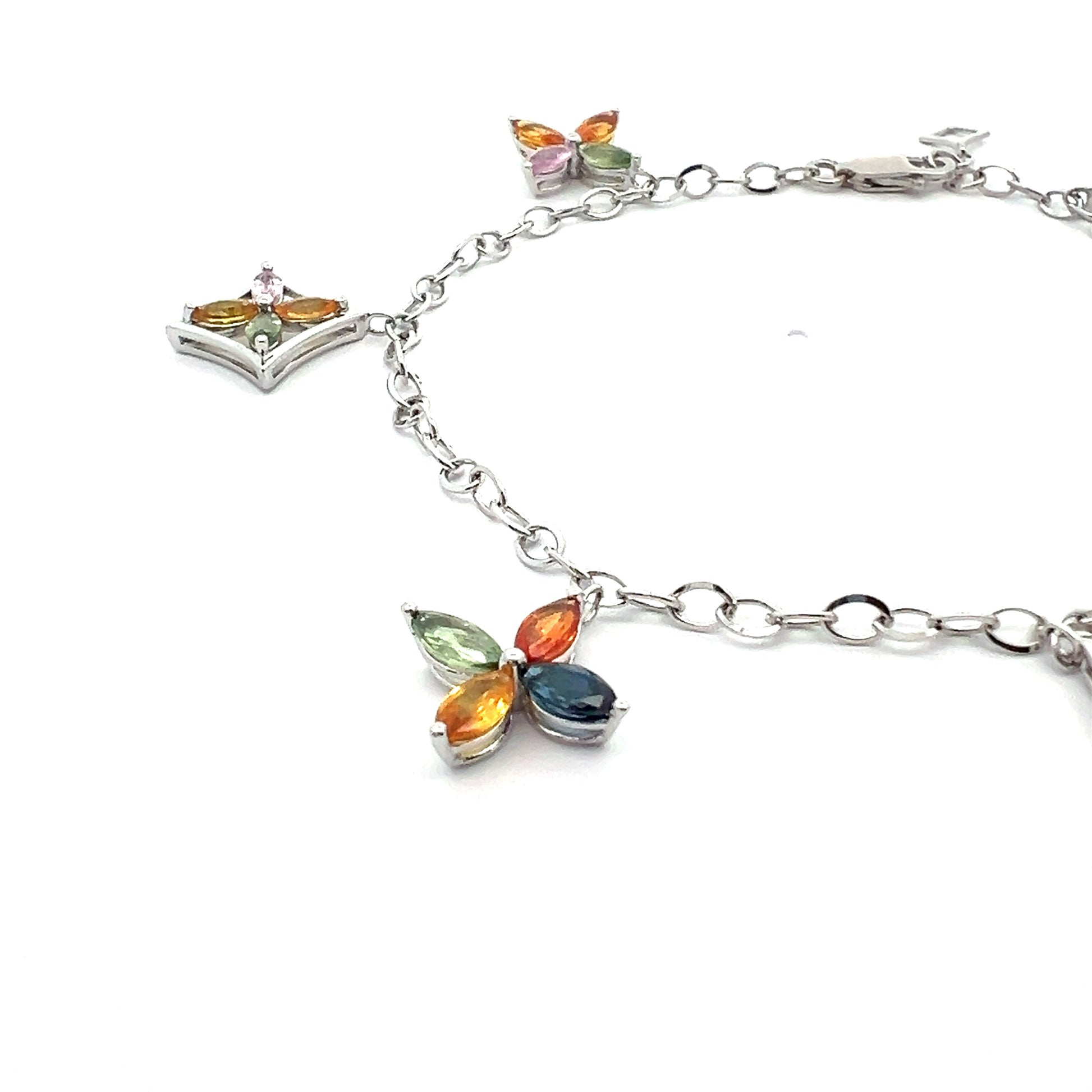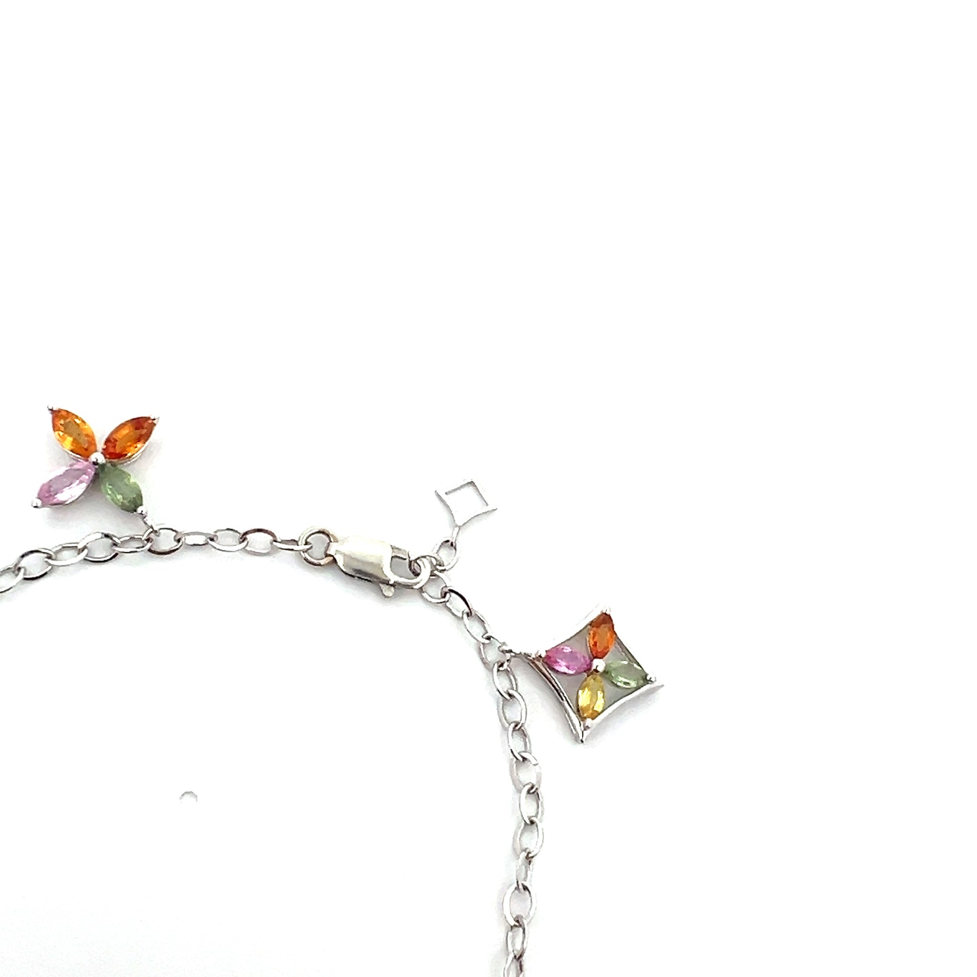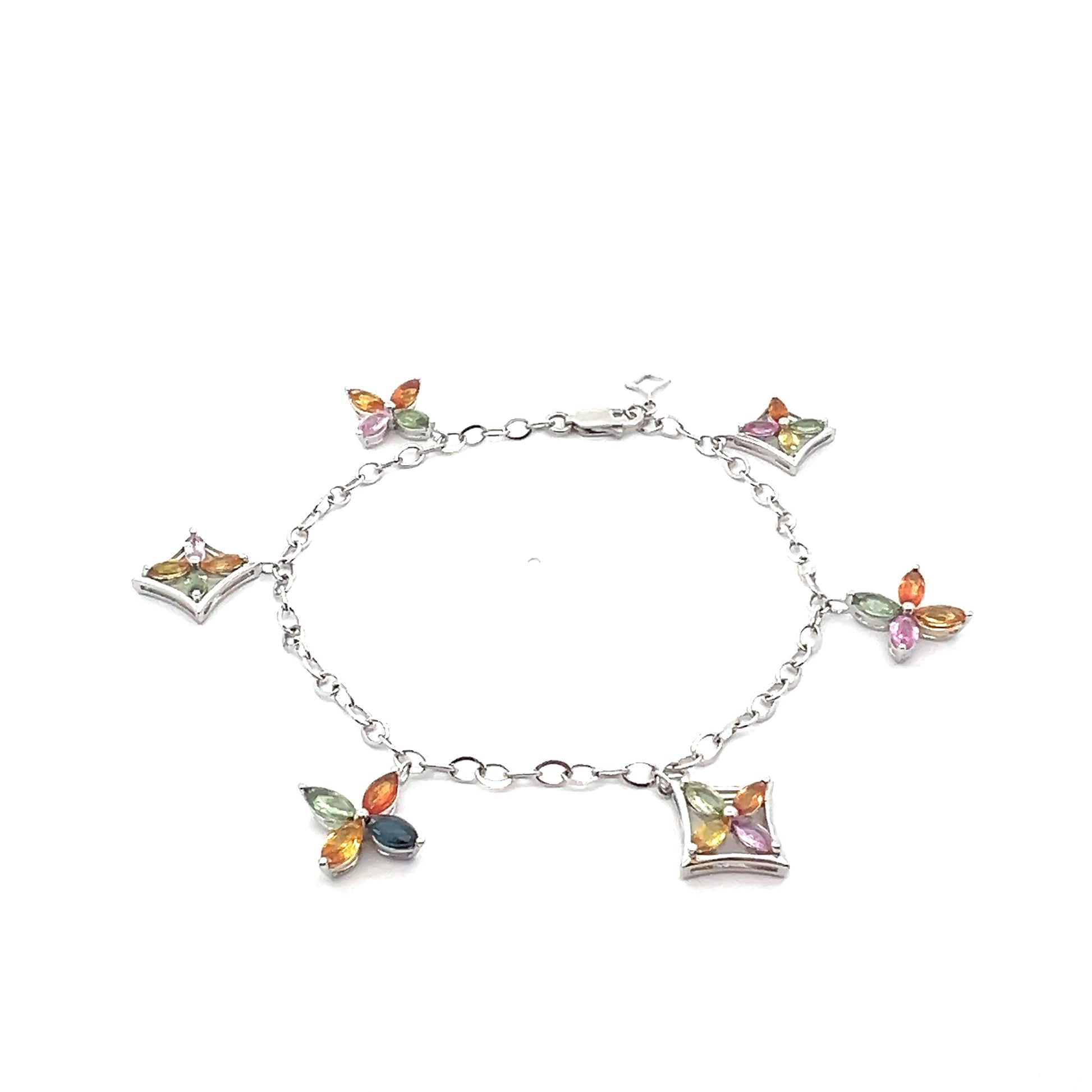 用我們異想天開的優雅星星吊飾手鍊裝飾您的手腕。這款精緻的白金鍊式手鍊飾有精美的彩色藍寶石吊飾,是俏皮與優雅的時尚交響曲。